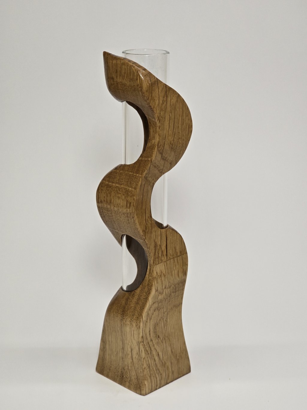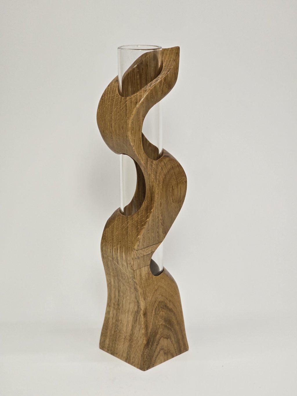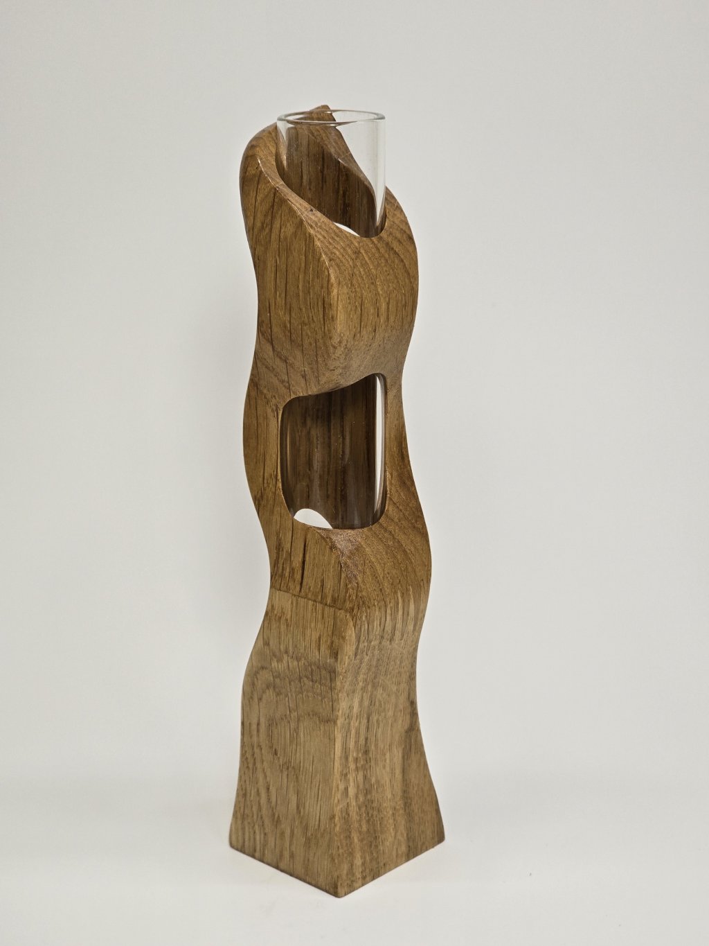Elegantní dubová váza o rozměrech 4 × 4 × 18 cm, vytvořená ručně v dílně Eddies Woodworking. Každý kus vzniká pečlivým ručním vyřezáváním.