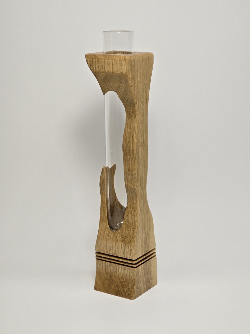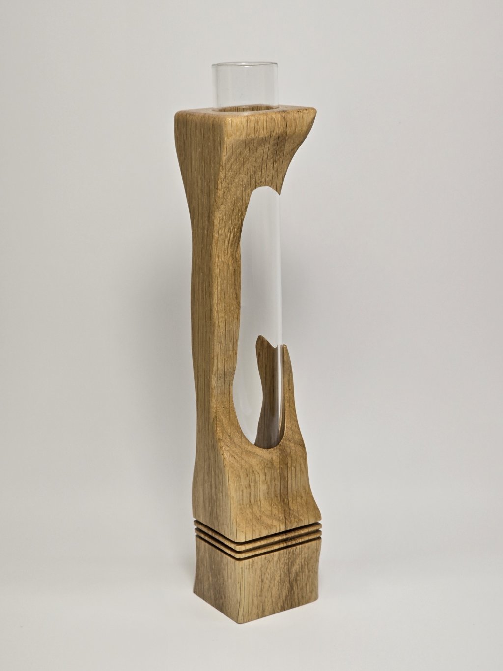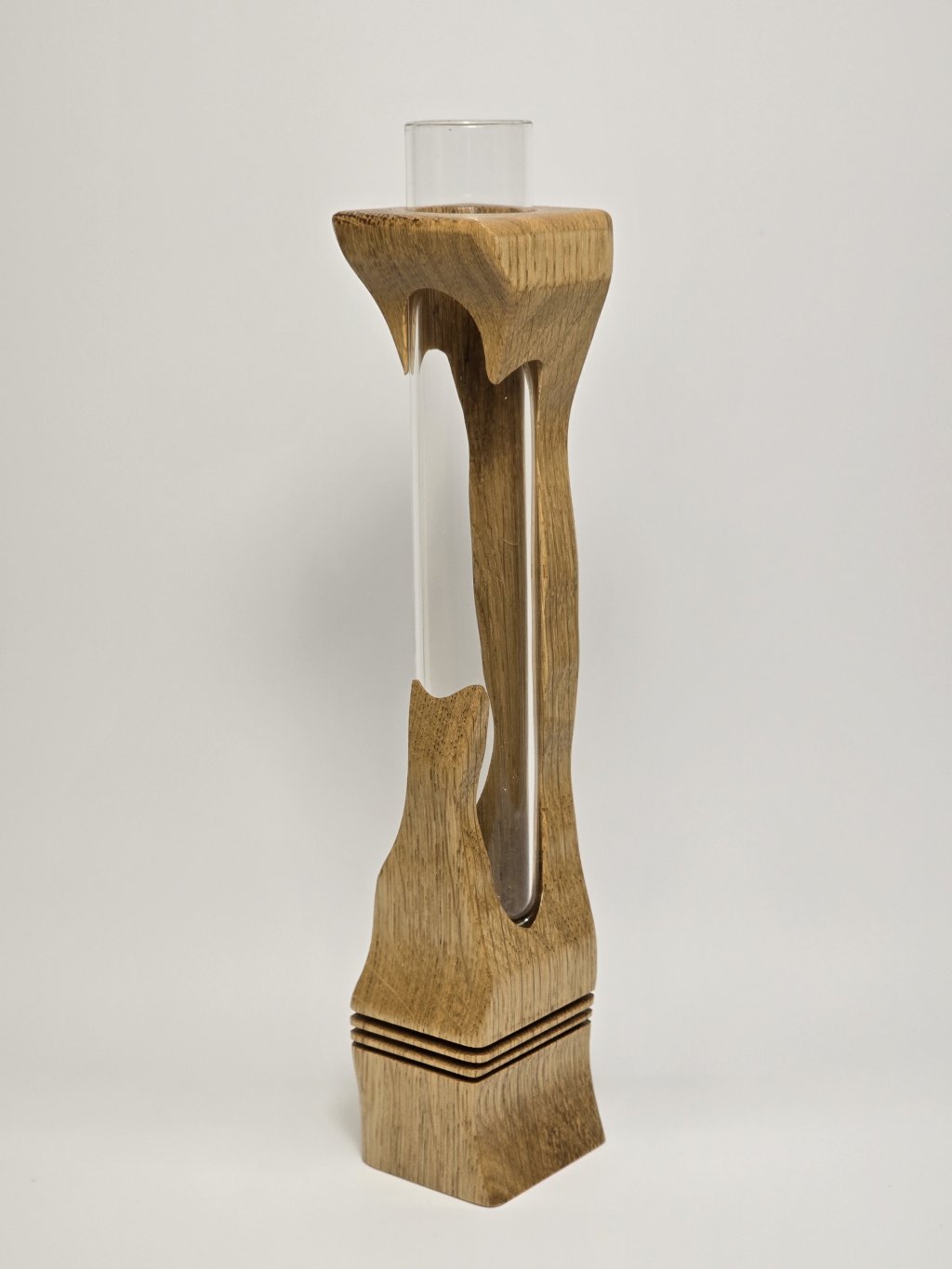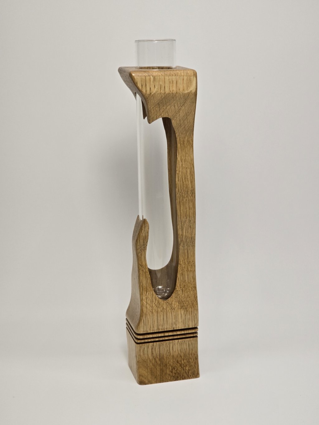Elegantní dubová váza o rozměrech 4 × 4 × 19 cm, vytvořená ručně v dílně Eddies Woodworking. Každý kus vzniká pečlivým ručním vyřezáváním.