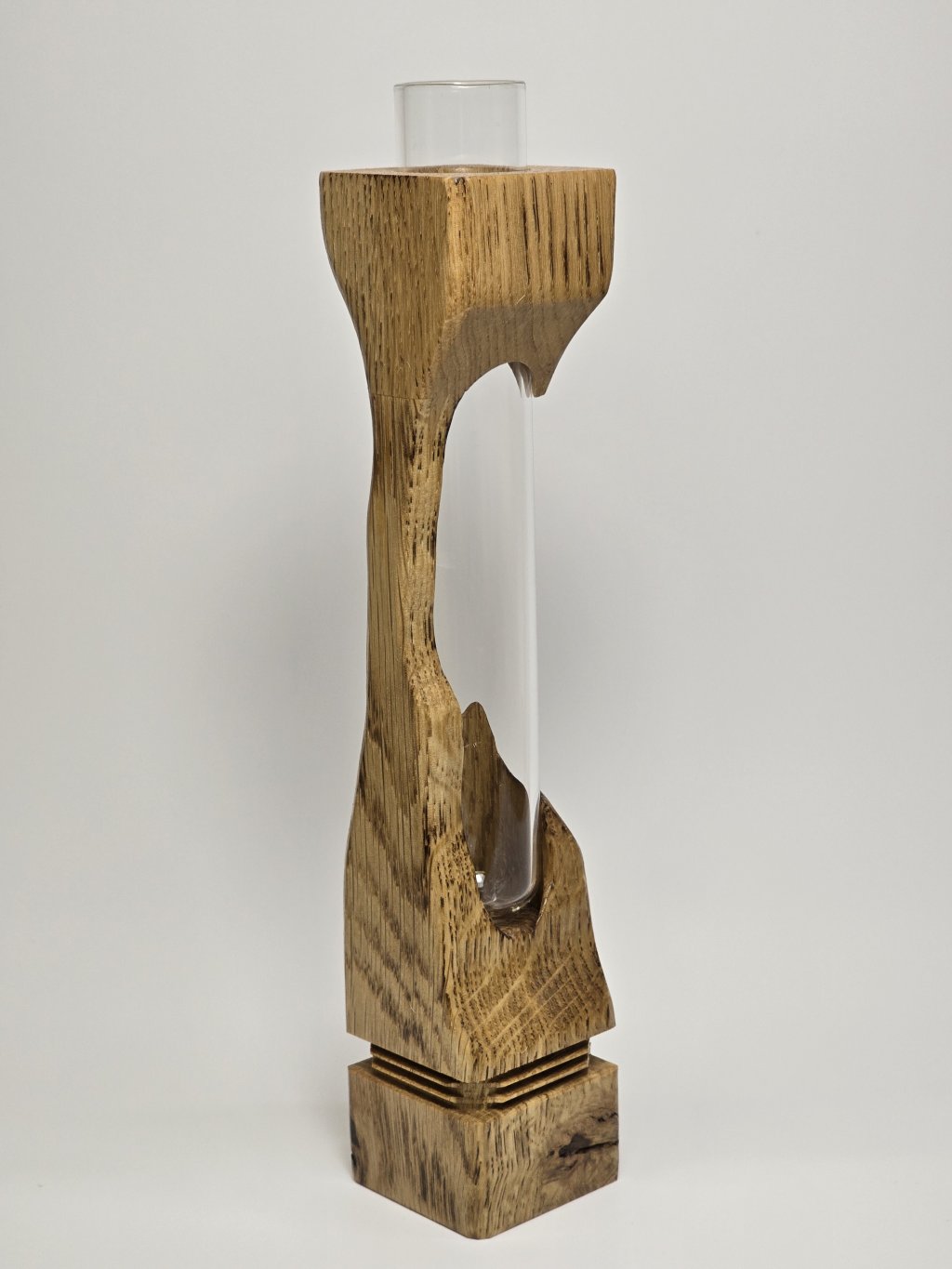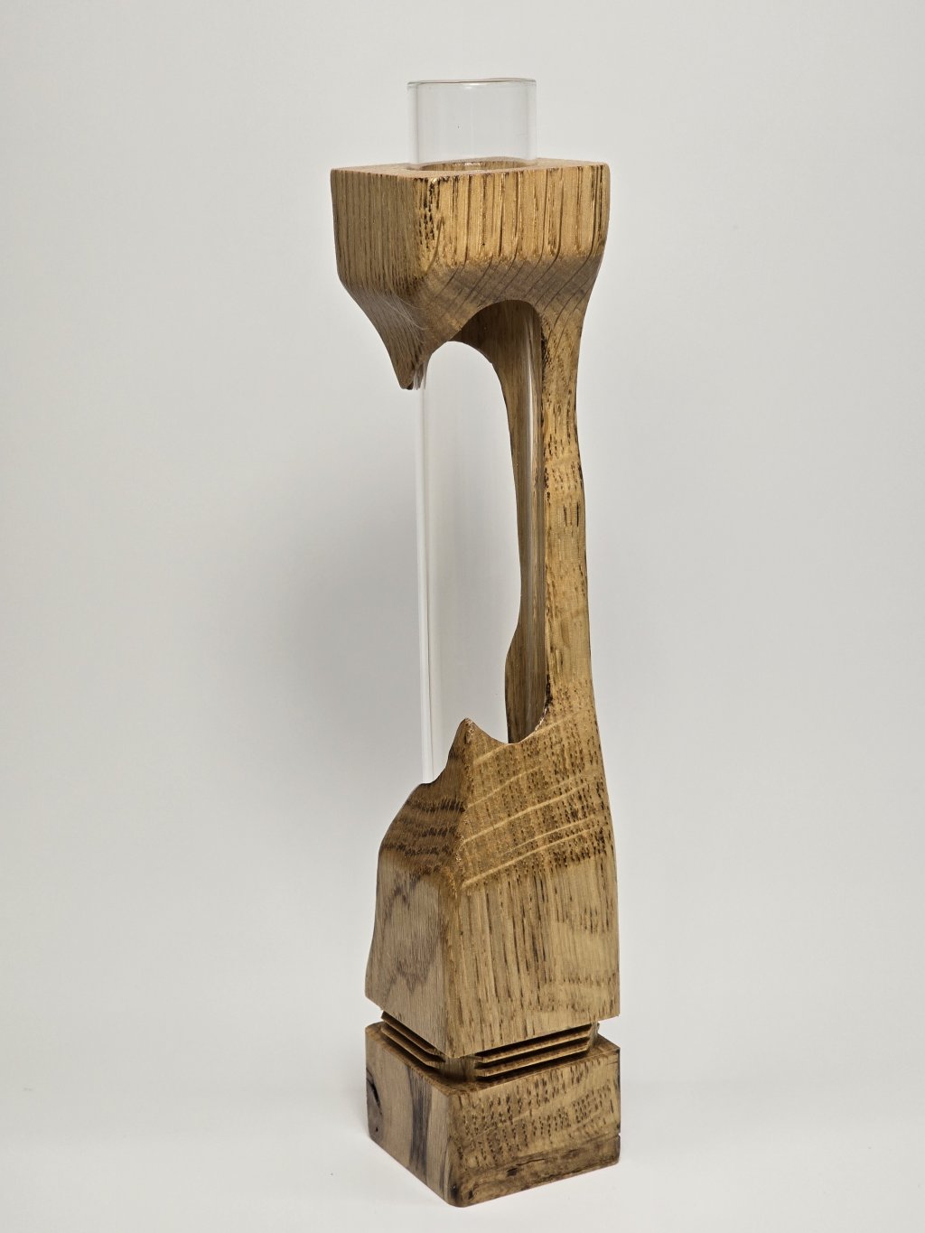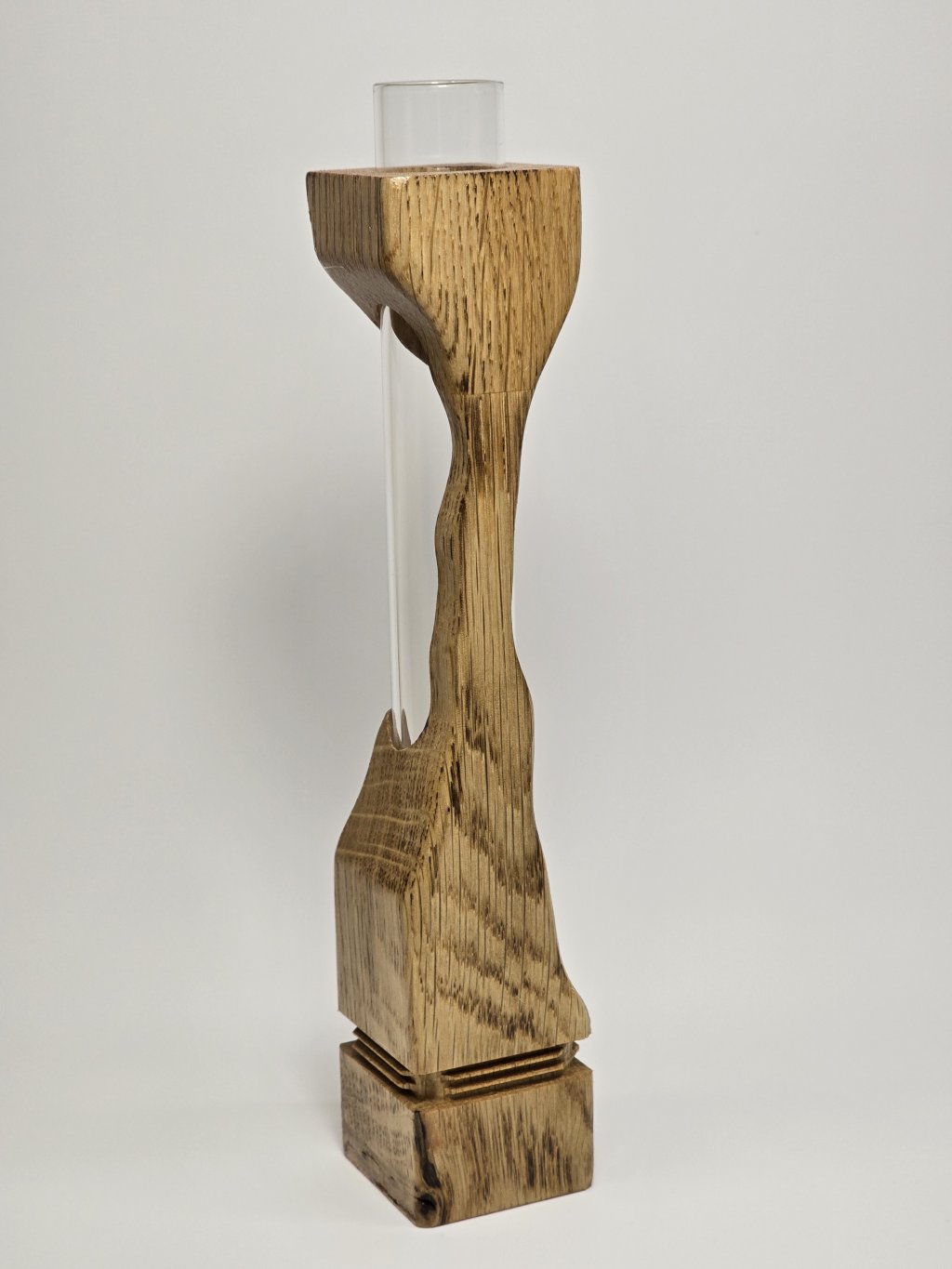 Elegantní dubová váza o rozměrech 4 × 4 × 20 cm, vytvořená ručně v dílně Eddies Woodworking. Každý kus vzniká pečlivým ručním vyřezáváním.