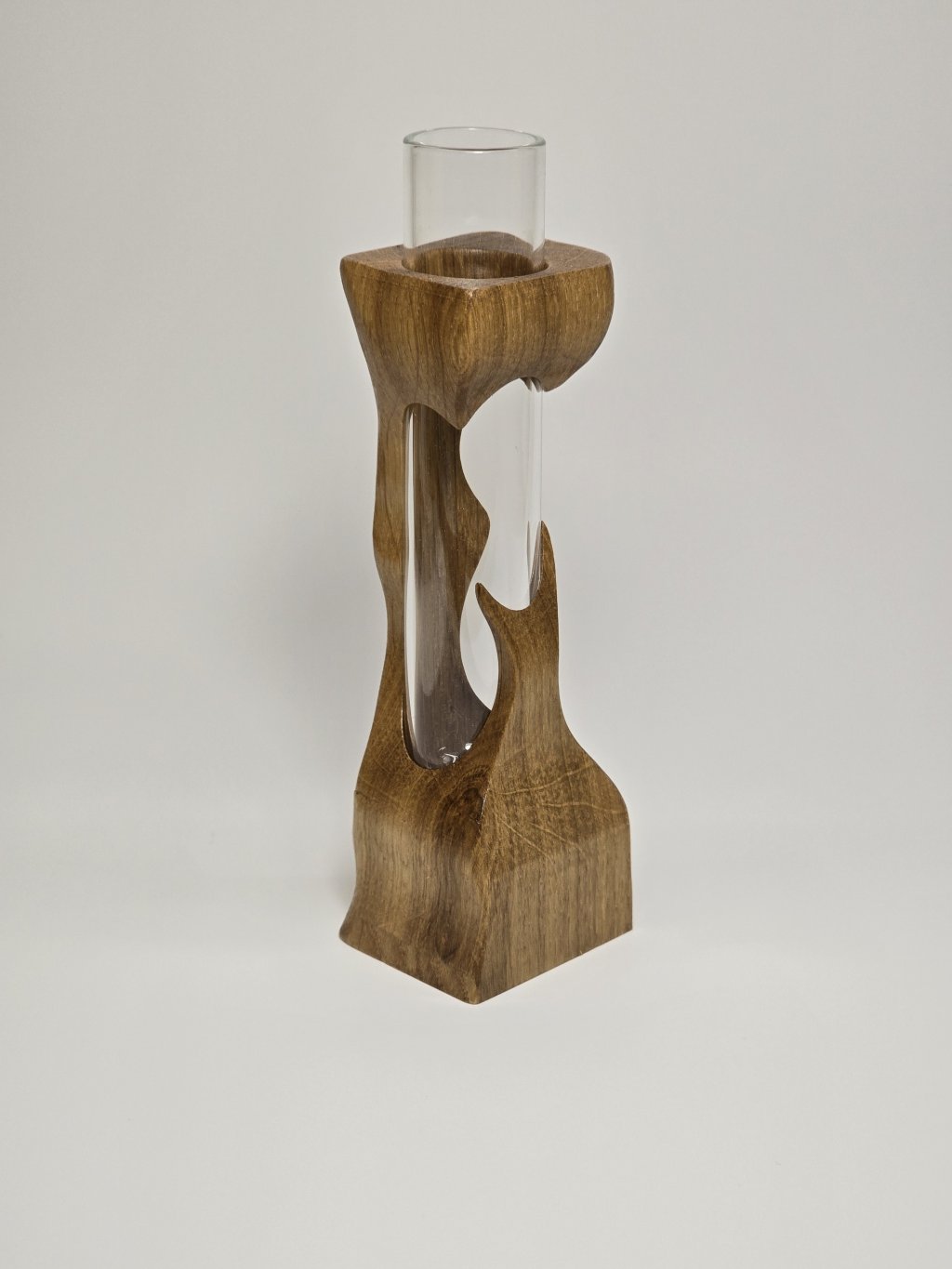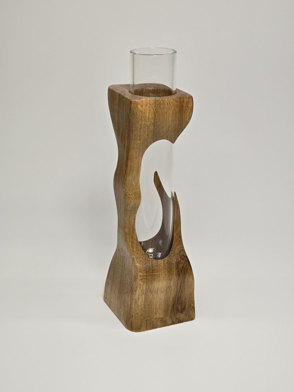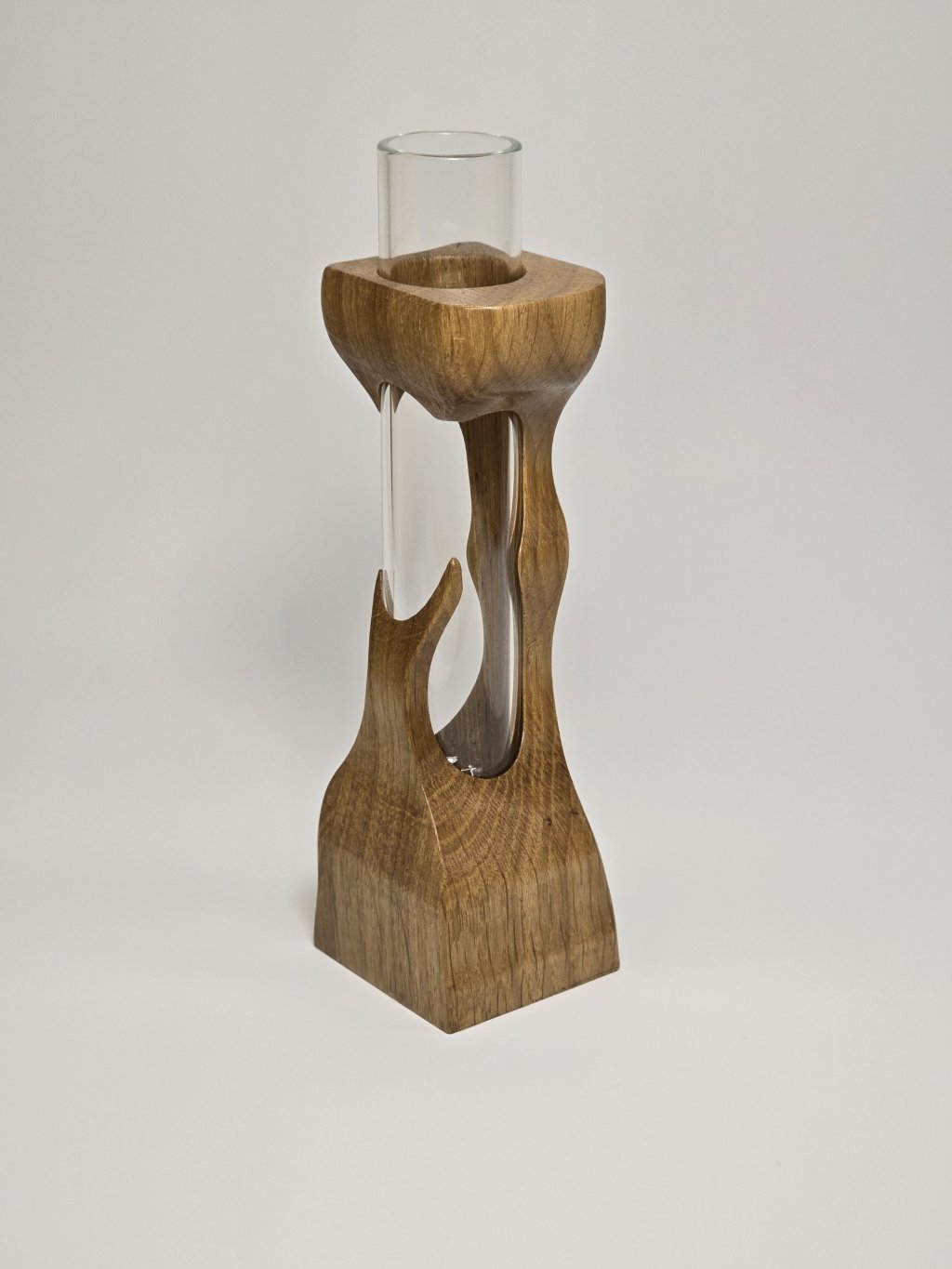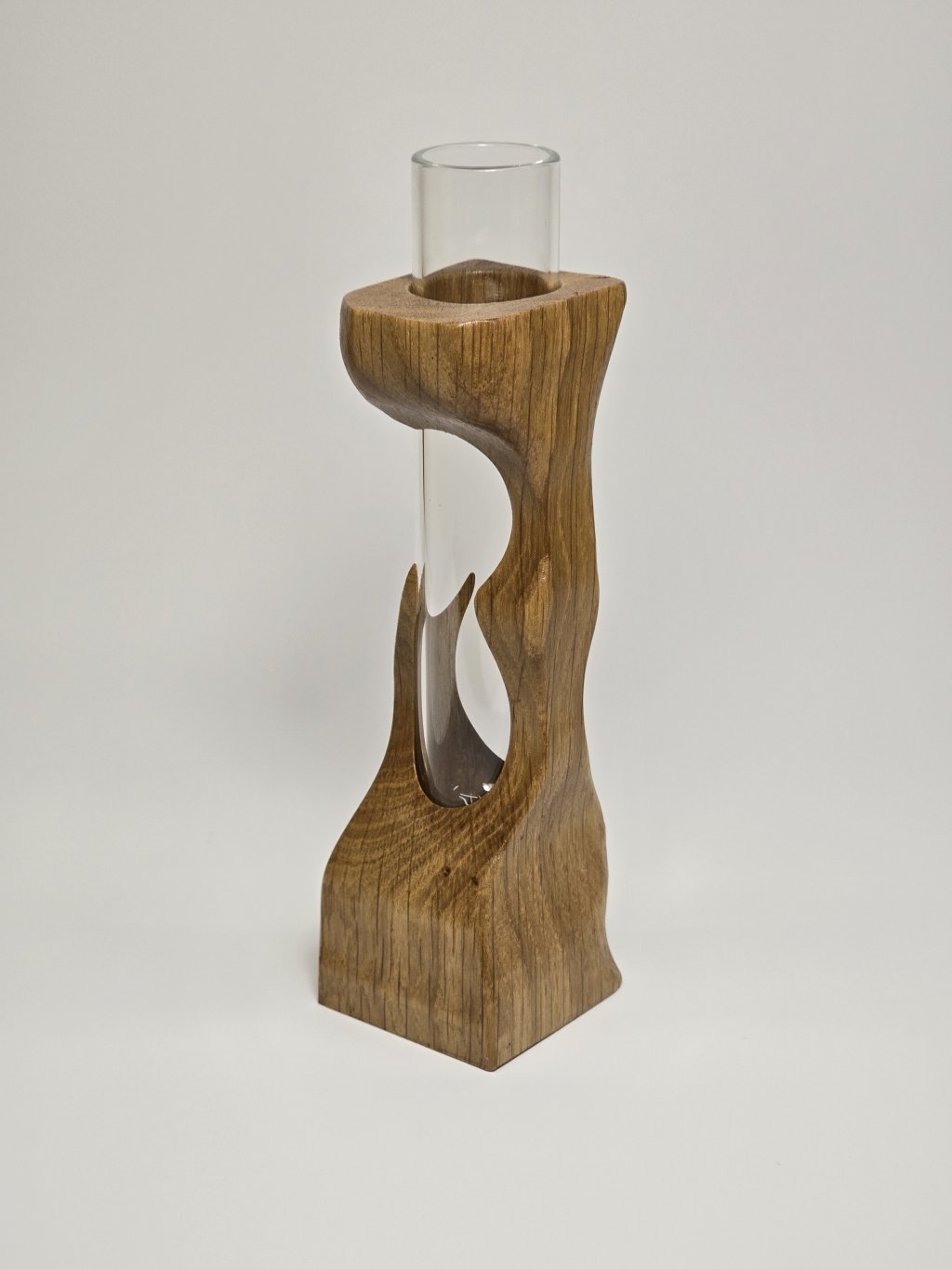 Elegantní dubová váza o rozměrech 4 × 4 × 13 cm, vytvořená ručně v dílně Eddies Woodworking. Každý kus vzniká pečlivým ručním vyřezáváním.