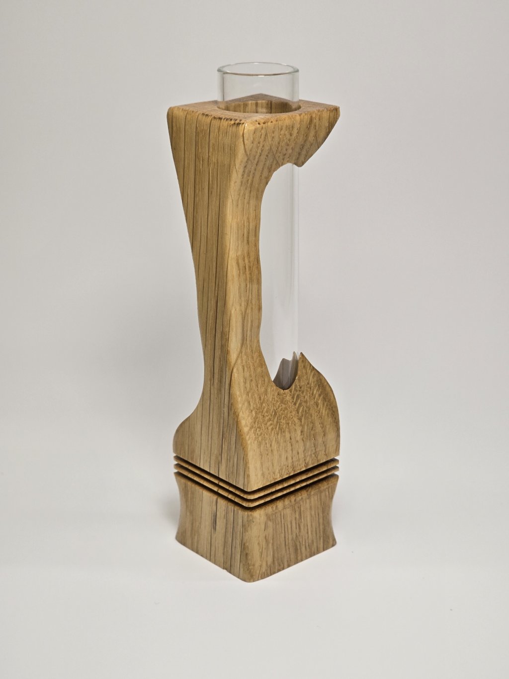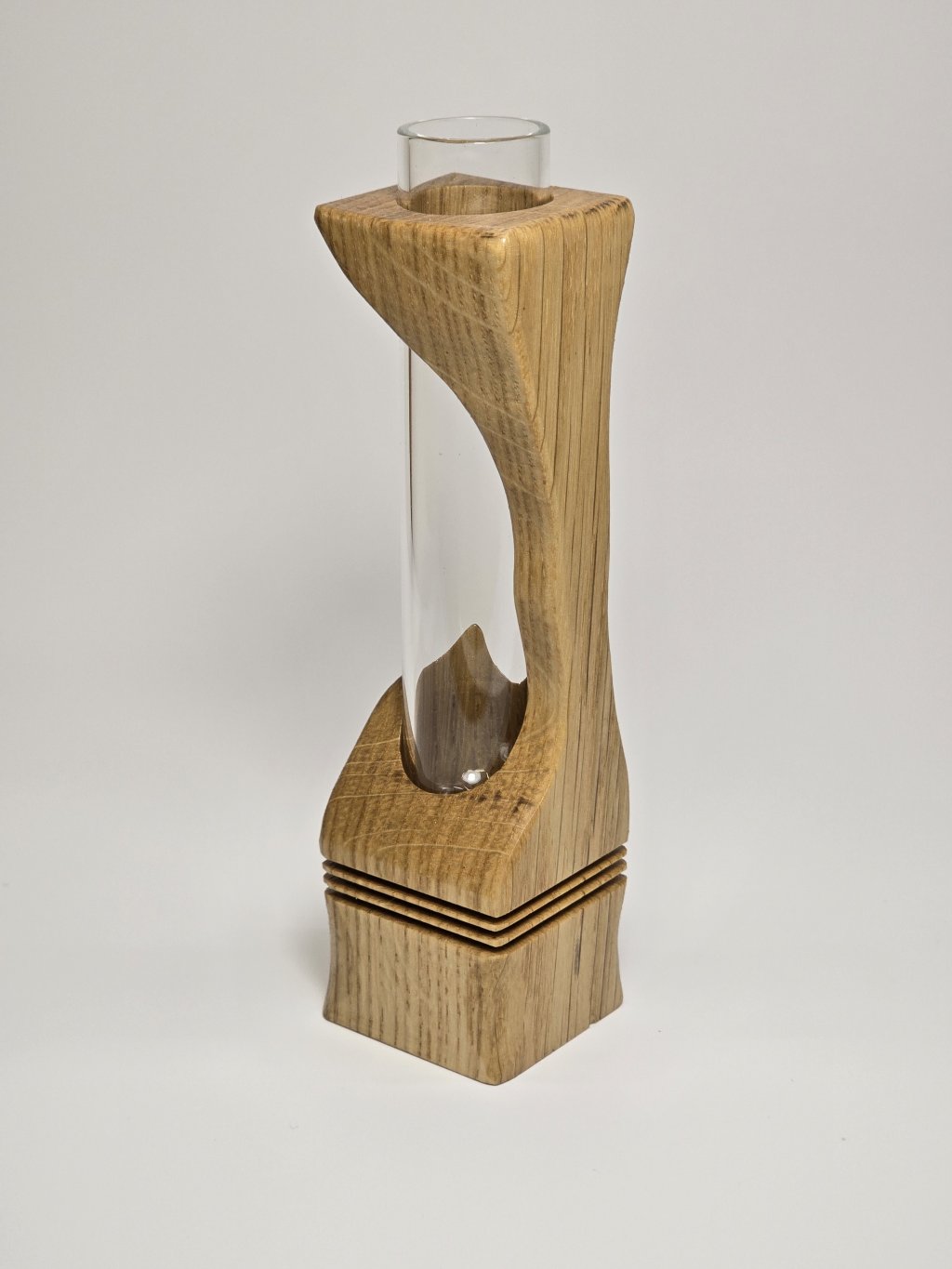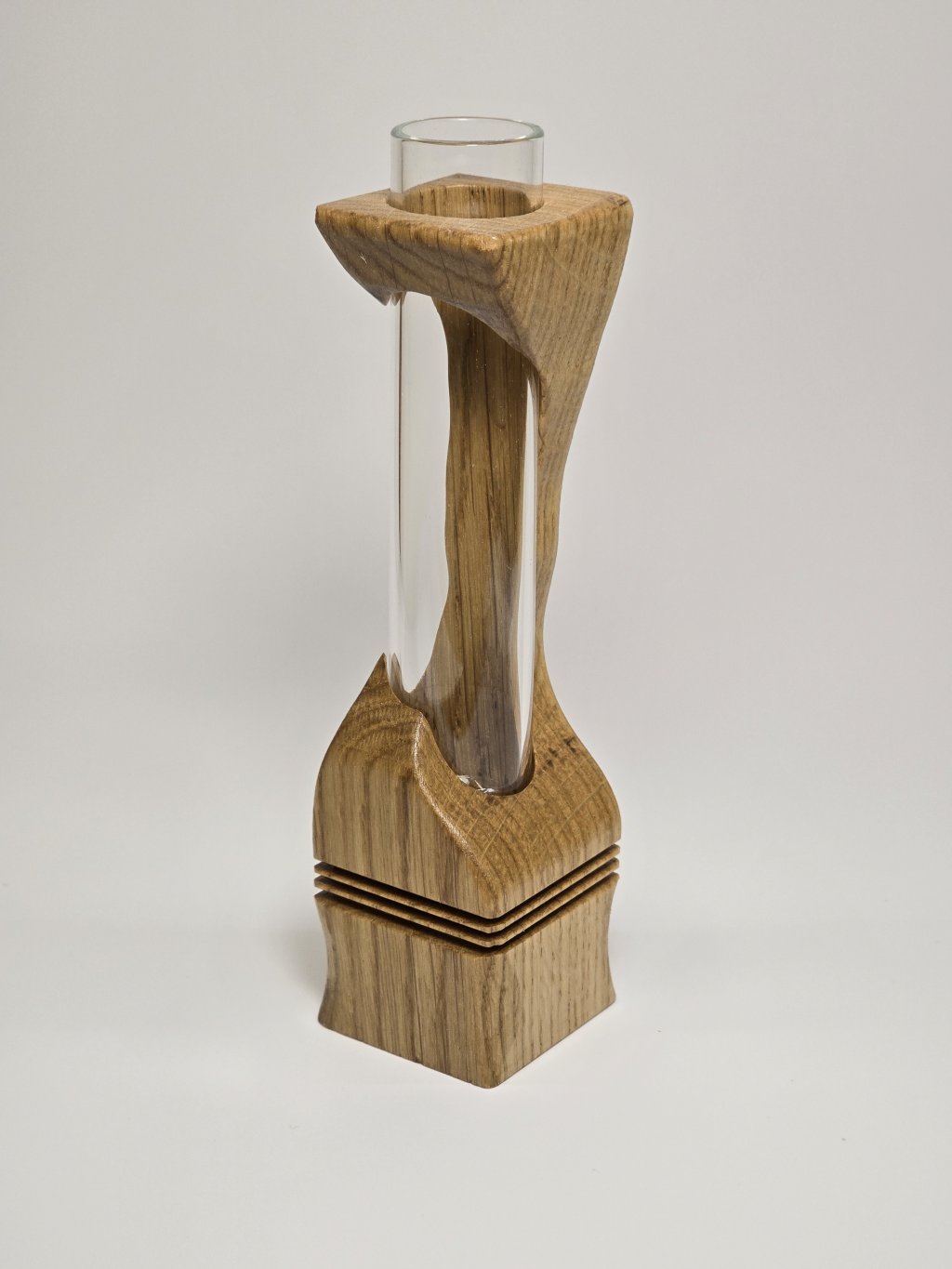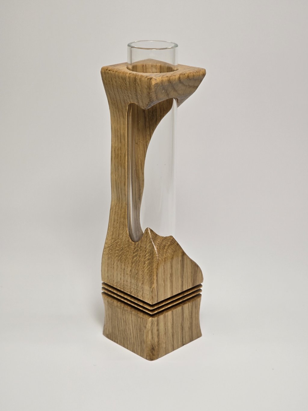Elegantní dubová váza o rozměrech 4 × 4 × 14 cm, vytvořená ručně v dílně Eddies Woodworking. Každý kus vzniká pečlivým ručním vyřezáváním.