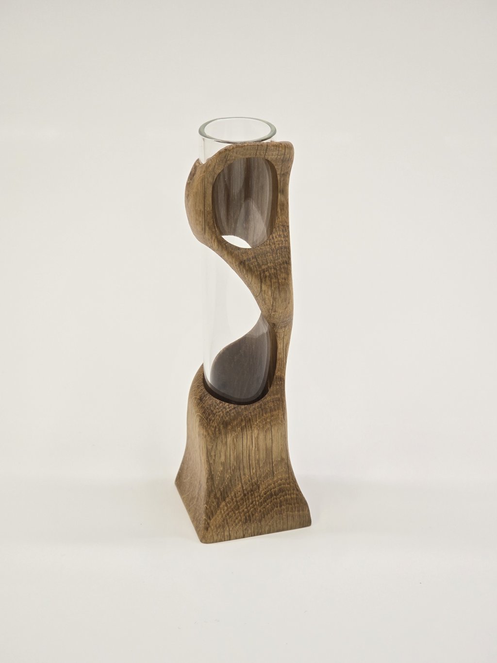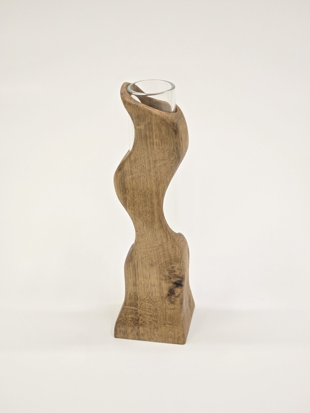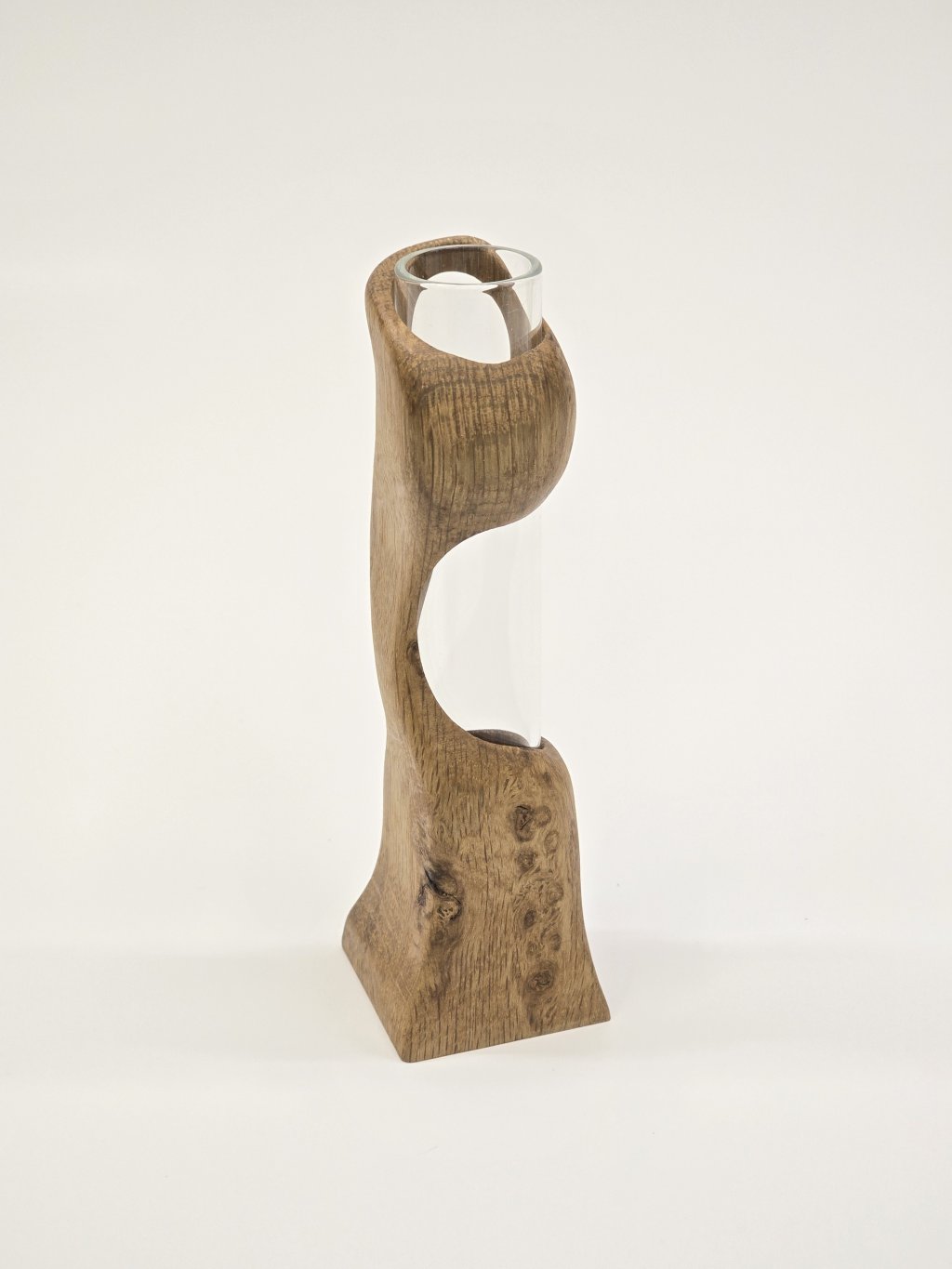 Elegantní dubová váza o rozměrech 4 × 4 × 14 cm, vytvořená ručně v dílně Eddies Woodworking. Každý kus vzniká pečlivým ručním vyřezáváním.