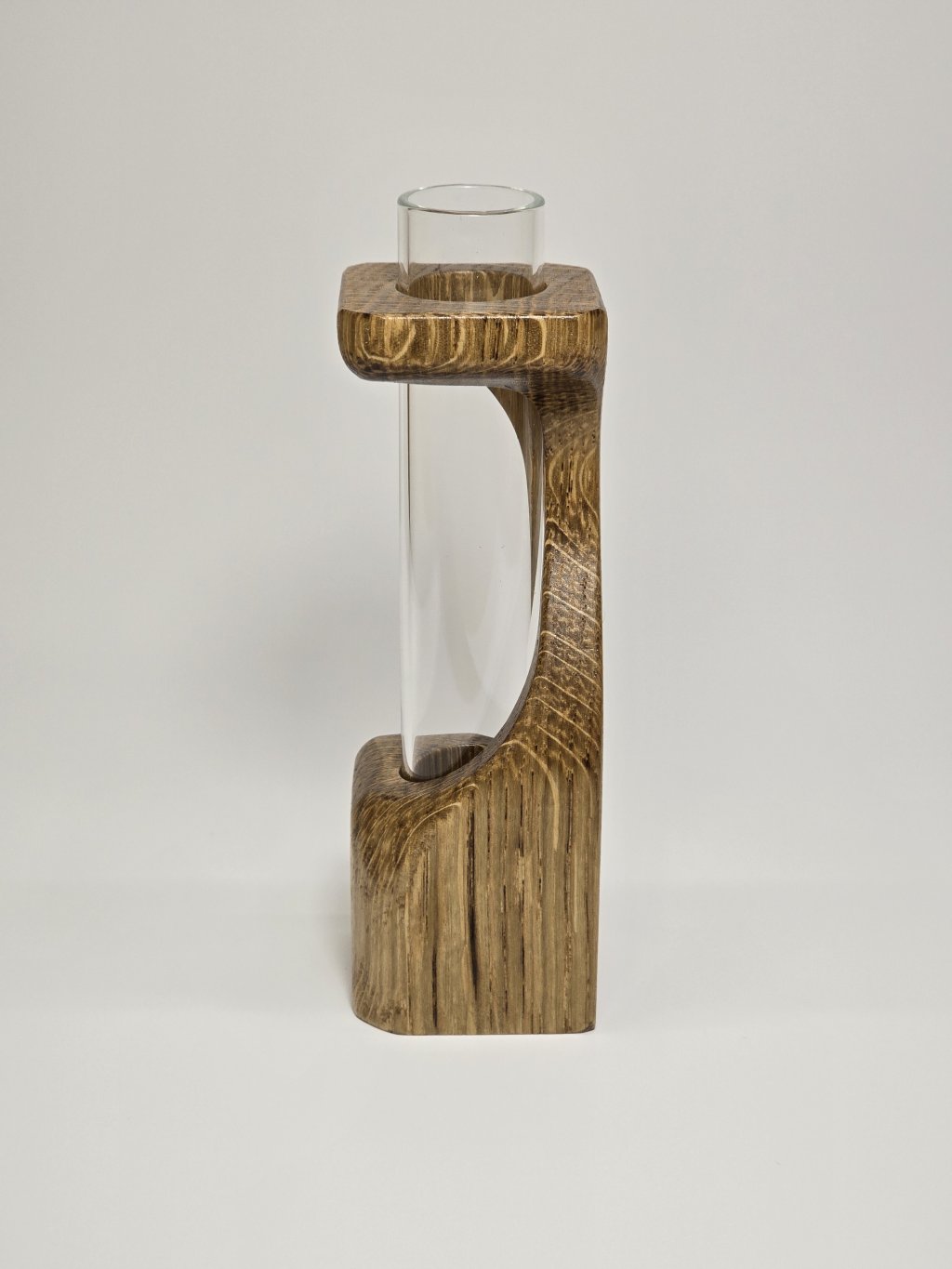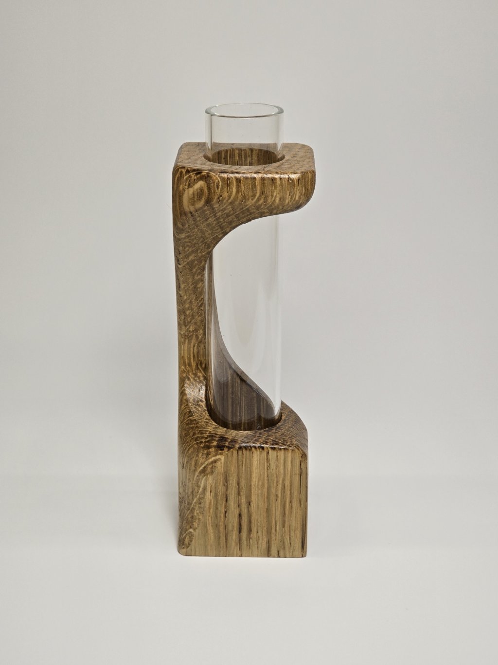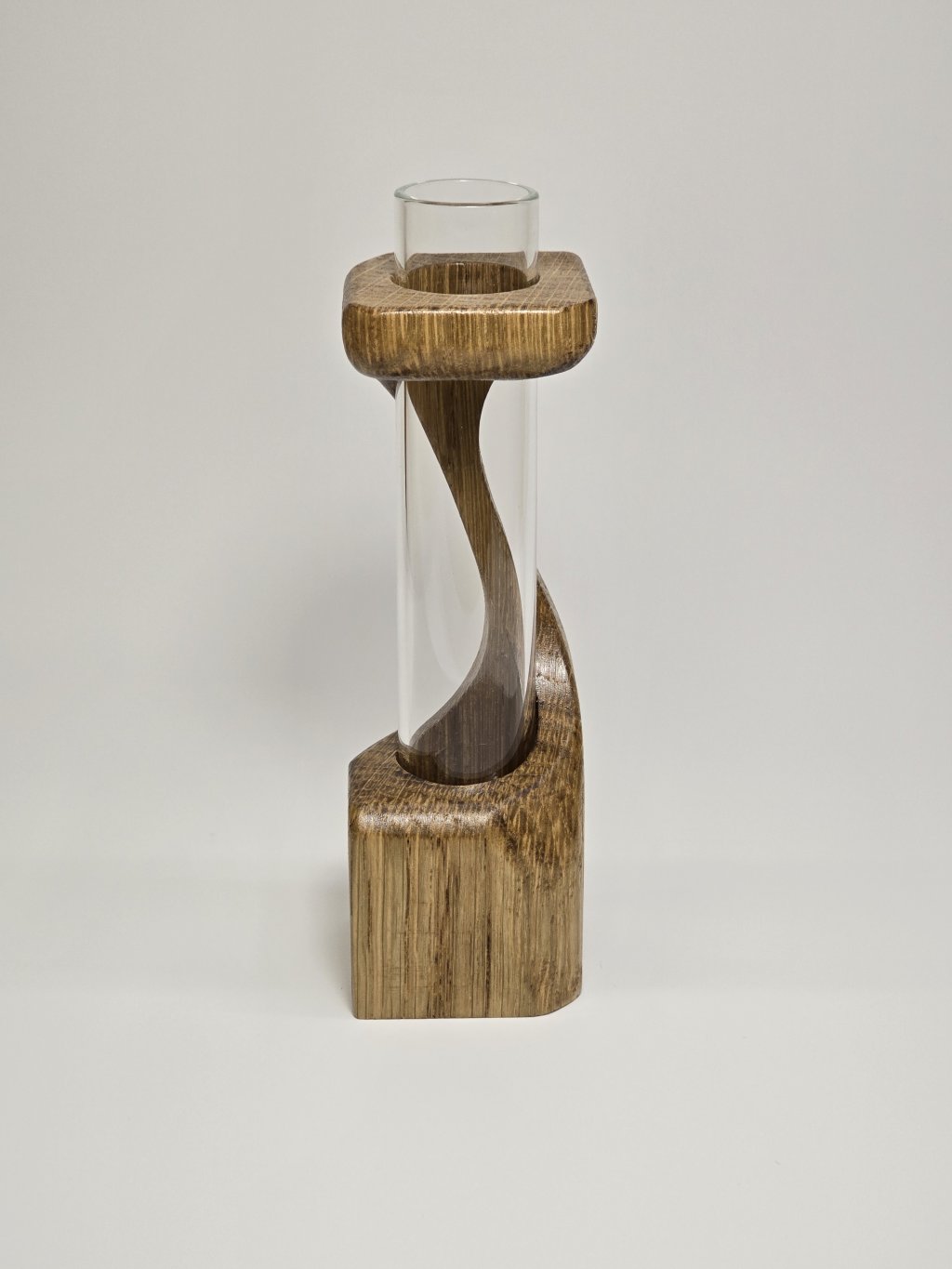 Elegantní dubová váza o rozměrech 4 × 4 × 13 cm, vytvořená ručně v dílně Eddies Woodworking. Každý kus vzniká pečlivým ručním vyřezáváním.
