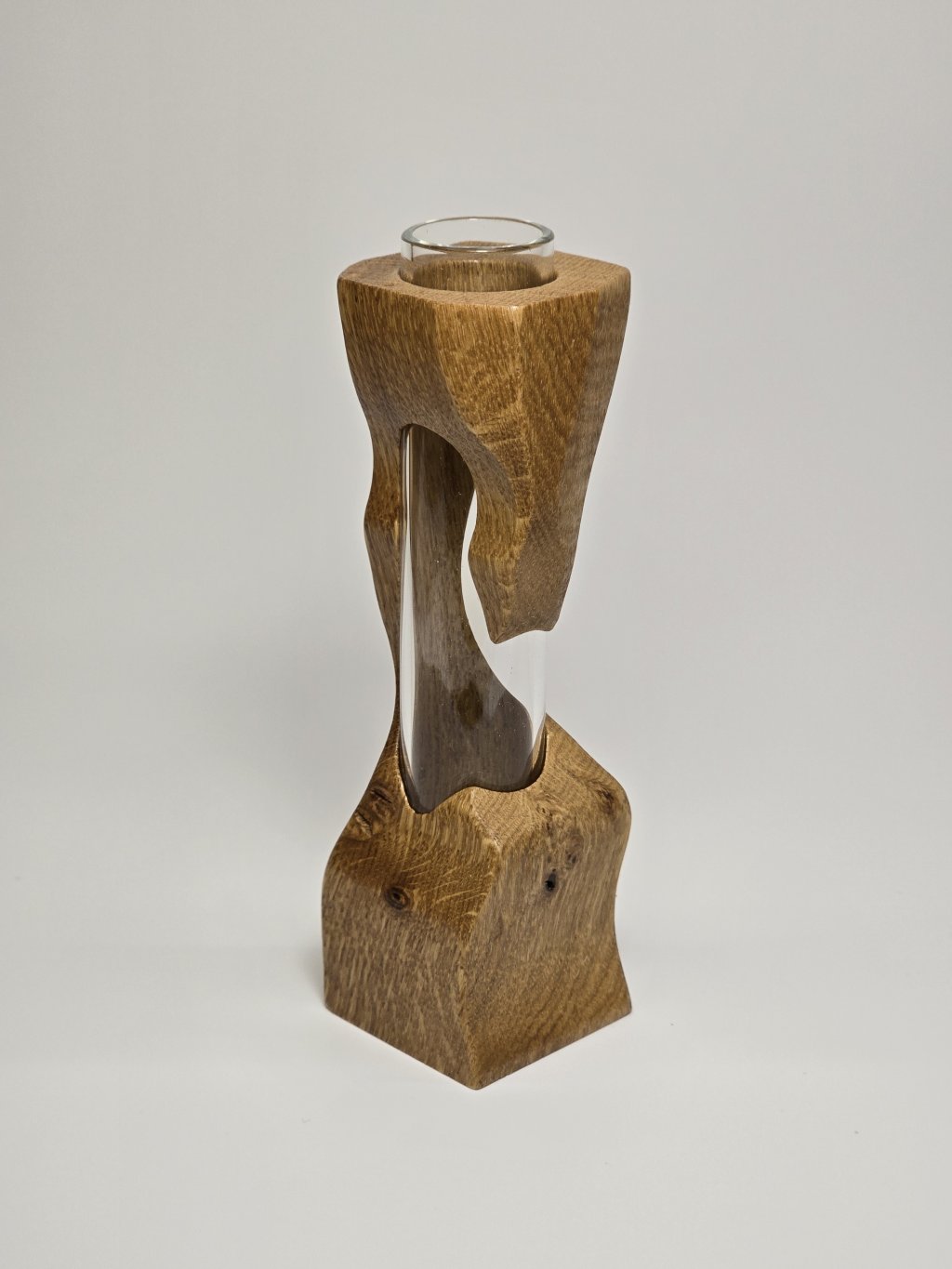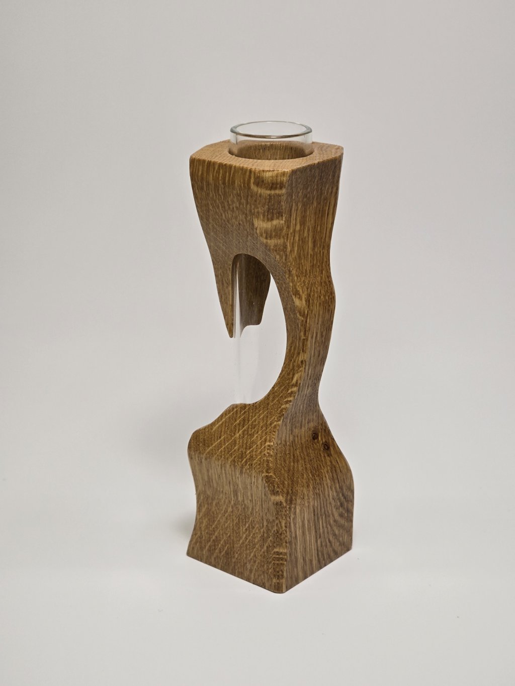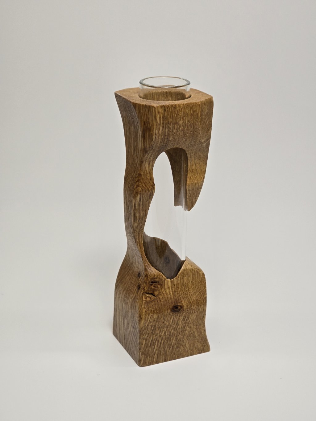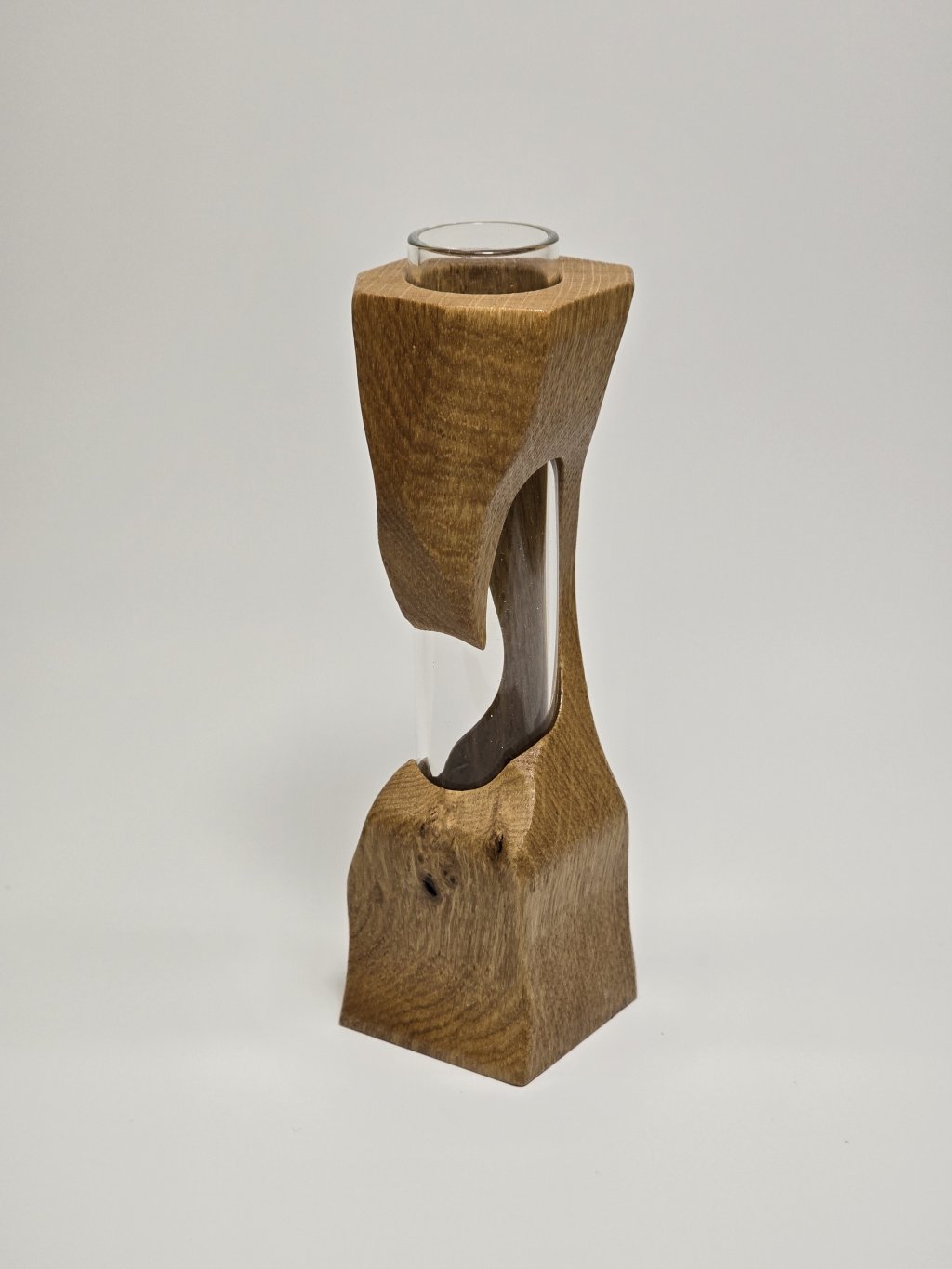 Elegantní dubová váza o rozměrech 4 × 4 × 13 cm, vytvořená ručně v dílně Eddies Woodworking. Každý kus vzniká pečlivým ručním vyřezáváním.