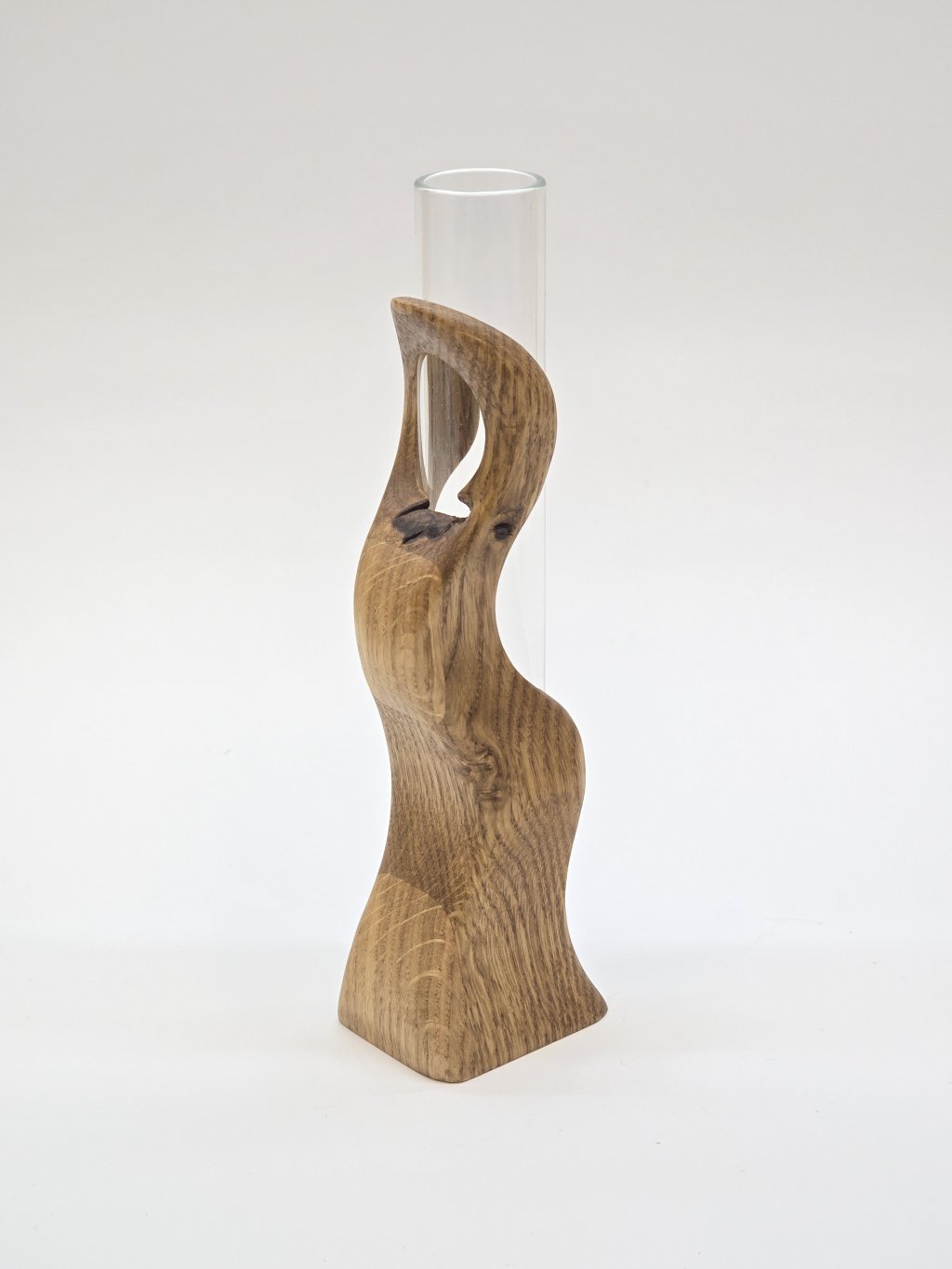 Elegantní dubová váza o rozměrech 4 × 4 × 14 cm, vytvořená ručně v dílně Eddies Woodworking. Každý kus vzniká pečlivým ručním vyřezáváním.